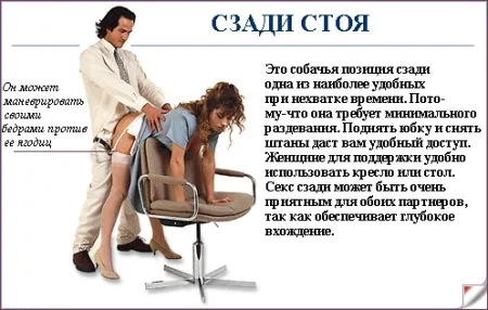 Поза стоя - это поза, которая требует гибкости и усилий от обоих партнеров. Оба партнера могут находиться лицом друг к другу или женщина может находиться спиной к мужчине. В первом случае женщина может обхватить партнера одной или двумя ногами, а к партнеру, а партнер - к ее гениталиям. Эта поза может быть достаточно интимной и возбуждающей для обоих партнеров, но она требует некоторого уровня комфорта и доверия друг к другу.
