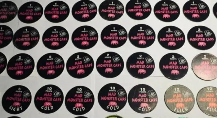 Фишки серии "Mad monster caps" по сути представляли из себя точно такие же фишки как "Mad caps". Разве что их задняя часть была черного цвета, а на самих изображениях были нарисованы различные монстры и нечисть.