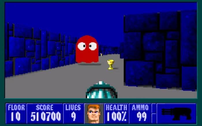 2. Разработчики игры решили вдохновиться проектированием плоских лабиринтов и добавить секретный уровень, где Би-Джей собирает сокровища в лабиринте и избегает преследования знакомых разноцветных привидений, похожих на тех, что встречаются в "Pac-Man". Чтобы попасть на этот уровень, необходимо пройти седьмой уровень Рейхстага.