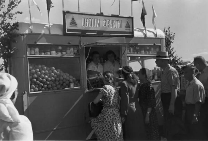 Ещё один передвижной вагончик, где продают на этот раз овощи и фрукты. Или правильно это называется автолавка? Забавно, но и сейчас можно встретить нечто подобное. Во всяком случае, в провинции такие вещи попадаются.
