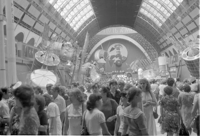 Почти по центру следующего кадра можно разглядеть молодую девушку и, по всей видимости, она со своим молодым человеком и наведывалась тогда в столицу огромной империи. Думаю рассказывать о том, где именно сделан этот кадр, нет никакого смысла. Если музей космонавтики со стелой около него кому-то и неизвестен, то уж шпиль Останкинской башни точно все знают. А фото видимо, сделано около входа в метрополитен на станции ВДНХ. Одна из самых загруженных станций метро к слову. Туристы туда любят ездить, как видите со времён Советского Союза и оно логично.