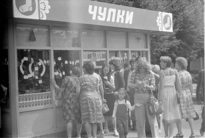 Ещё немного торговли в главном нашем городе. Опять же видны масштабы распространения ларьков и видно, что уже тогда медленно, но верно всё двигалось к немыслимому разнообразию товаров. Чулки, носки, галантерея, чуть позже в таких киосках вообще будут продавать всё подряд, и они будут заменять современные супермаркеты.