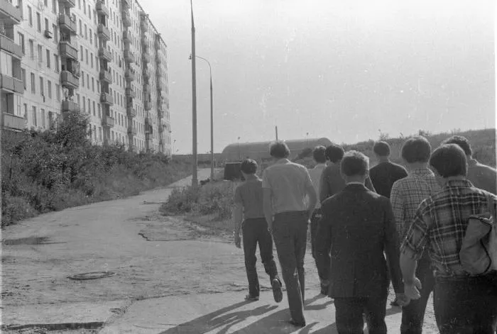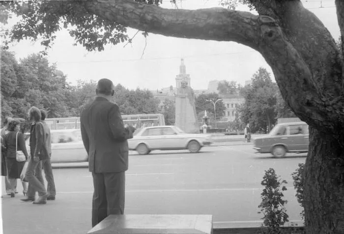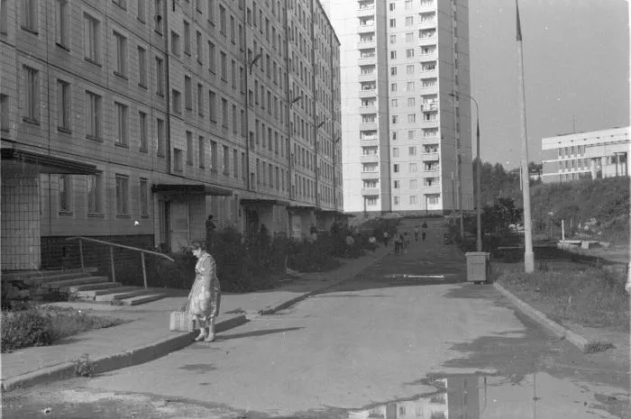 Впрочем, всё это не так уж и важно. Куда важнее то, что человек не пожалел потратить драгоценную плёнку на кадры спального района. Обратите внимание, что припаркованных машин нет вообще. Как-то незаметно они стали частью окружающего мира, хотя ещё недавно всё было иначе.