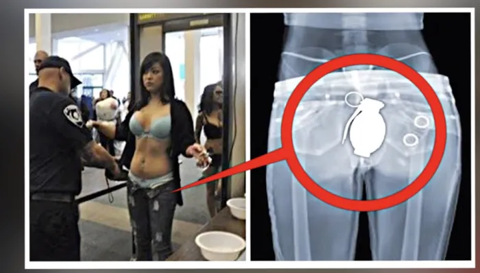Существует сканер и для людей, его ещё называют “голый сканер”. Он работает за счёт применения двух видов излучения и через него сотрудники службы досмотра и безопасности видят все предметы очень детально. Тому доказательство — фото, на нём видно, что женщина пыталась перенести в себе гранату. Возникает только вопрос — зачем?