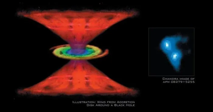 Вдобавок чёрная дыра постоянно выбрасывает прочь из своей галактики струи вещества, и её огромный джет достигает в длину 150 000 световых лет — больше, чем предполагаемый диаметр нашего Млечного Пути. Хорошо, что эта штука расположена в двух миллиардах световых лет от Земли и посылаемые ею «лучи добра» нацелены не на нас.