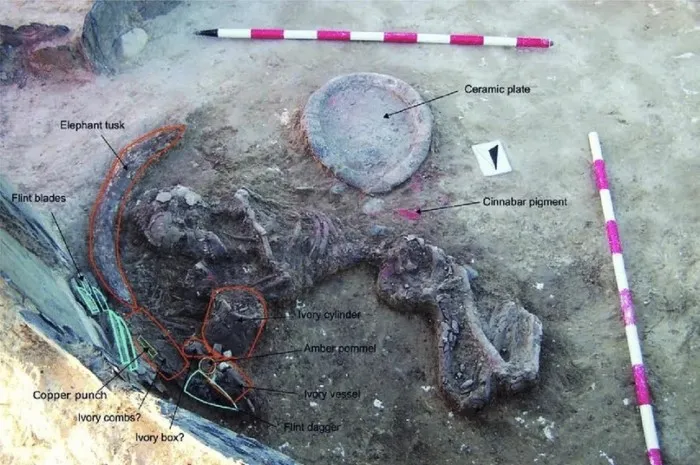 Необработанный бивень слона лежал над головой этого человека, позади него большое керамическое блюдо, набор из 23 кремневых лезвий, многочисленные фрагментированные предметы из слоновой кости (многие украшенные, в том числе две чаши), кремневый кинжал, найденный рядом с янтарным (!) навершием и небольшой медный предмет, сильно поврежденный коррозией, форму и назначение, которого трудно определить. Все погребение покрыто красным пигментом (соединение киновари).