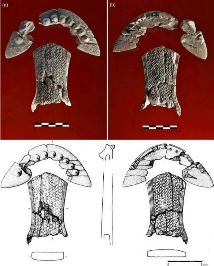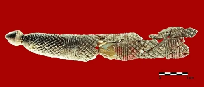 Рукоять кинжала. Изначально было выдвинуто несколько версий назначения этого предмета (амулет или навершие посоха), в конечно итоге археологи согласились, что это именно рукоять от лезвия из горного хрусталя, обнаруженного рядом.
