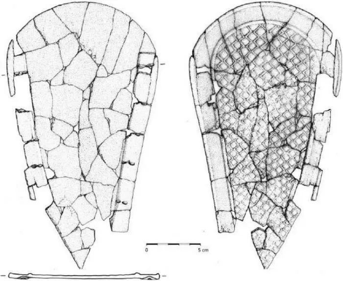 Она так же весьма фрагментирована, но при сборе ножны оказались идеально подходящими к кинжалу. Судя по отверстиям по краю пластин — передняя часть ножен была сделана из кожи и пришнуровывалась бечевкой к пластине.