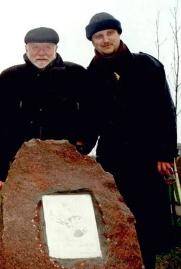 Кир Булычев и автор этой статьи Андрей Щербак-Жуков на закладке камня в начале Аллеи имени Алисы Селезневой, 2001 год. Фотография И. Борисенко