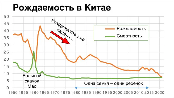 Китай из этого перехода сделал огромную проблему. Рождаемость была подорвана знаменитой социальной политикой: «одна семья – один ребенок». Этот губительный демографический проект был отменен только в 2015 году.