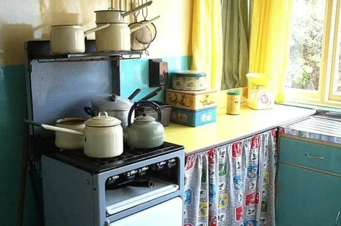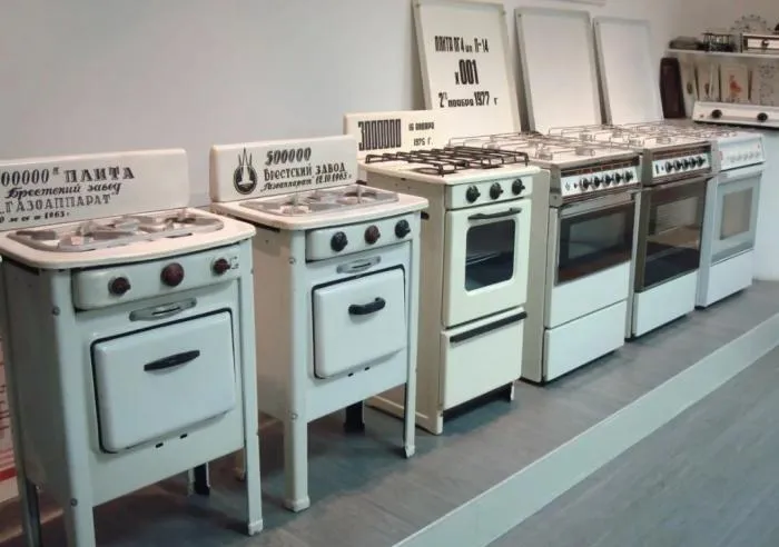Наверху стояли банки для круп, которые тогда тоже были не у всех. Поэтому выставлялись на всеобщее обозрение. Они выпускались преимущественно красного цвета в белый горох, с соответствующими надписями. Социалистические граждане с такой кухней условно считались зажиточными, их жизнь — удавшейся, и им дружно завидовали. Особенно банкам.Плиты были газовыми, без современных устройств, но пекли хорошо. Во многих местах, особенно на периферии, не было природного газа: использовался баллонный — баллоны подвозили по мере использования. А для выпечки пирогов покупались электрические печки: к баллонному газу можно было подключить только конфорки. Кстати, это всё имеет место и в наше время. Позже стали продаваться импортные плиты: плита «Горение», появившаяся в восьмидесятые годы, стоила сто десять рублей — как зарплата молодого специалиста.