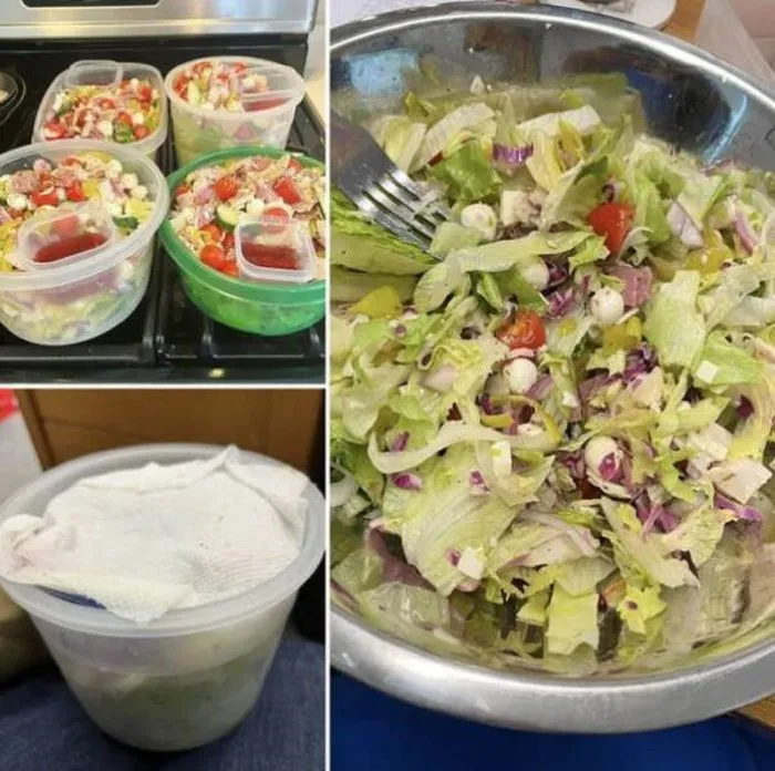 11. Овощной салат останется свежими чуть дольше, если положить под крышку бумажное полотенце