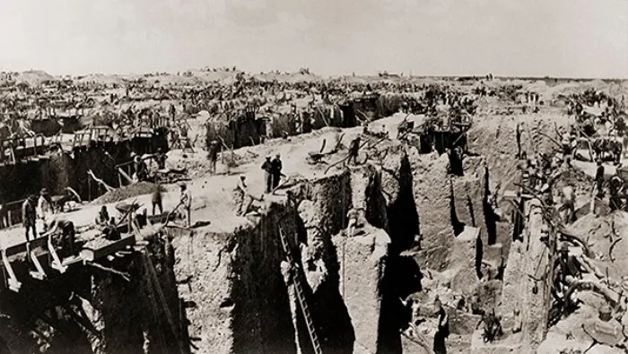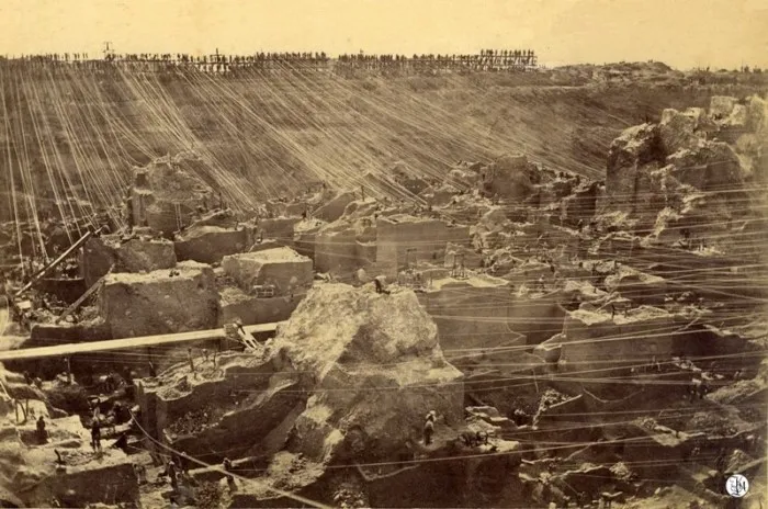 Фото 1872 года, одна из транспортировочных дорожек между участками. Брошенная в её начале тачка как бы показывает, что не умеющие парковаться мудаки существовали задолго до эры массовой автомобилизации.