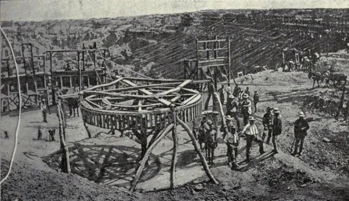 А коренное месторождение - это, например, гороховое поле. Горошины на нём встречаются гораздо реже, чем в пакете из магазина, но есть отличие: их больше. Настолько больше, что для их добычи можно купить дорогостоящий комбайн, потратить несколько дней на уборку поля и затраты финансов и времени всё равно окупятся стоимостью добытого. С коренными месторождениями полезных ископаемых всё то же самое: содержание полезного компонента в них меньше, чем в россыпи, но если это, как в случае с алмазами, жерло вулкана, уходящее в глубину, то добыча на таком месторождении может потребовать огромных финансовых вложений и растянуться на десятилетия (например, на Гайском медноколчеданном месторождении нижняя граница продуктивных запасов медной руды не найдена даже на момент написания этой статьи, хотя её ищут с 1950 года). В общем, изначально в 1871 году в Кимберли никто не надеялся надолго застрять в таком замечательном безводном и безлесном месте, все были настроены по-быстрому снять несколько метров алмазоносного рассыпного слоя и двигаться дальше навстречу новым открытиям. Территорию «россыпи» разбили на заявочные участки площадью 30х30 голландских футов (9,45 квадратных метров), зарезервировали транспортировочные дорожки для доступа к участкам и работа закипела.