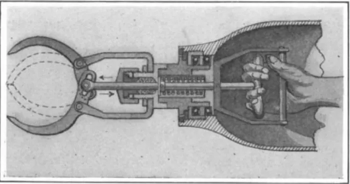 Одна рука костюма по умолчанию оснащалась мощным электрическим фонарем, а вторая механической клешней-захватом, которой водолаз управлял изнутри скафандра через передаточный механизм.