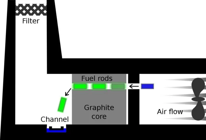 Охлаждался реактор обычным воздухом, который нагнетался за счет конвекции (как в обычной печи) и вытягивался через дымовую трубу высотой 120 метров. На случай, если этого не хватит, стояли вентиляторы для увеличения скорости потока воздуха. Тут у инспектора по безопасности глаза уже должны были бы полезть на лоб, так как радиоактивный воздух и пыль просто выбрасывались в атмосферу. Но это были 40-е, а потому про то, что безопасность – это главный приоритет, никто еще не знал. Когда один из руководителей строительства настоял на установке фильтров в трубе, стоивших огромных денег, и фильтры, и сам поступок называли вполне открыто “глупостью Кокрофта”. И действительно, ну чего он так деньги налогоплательщиков то разбазаривает? После аварии один из оппонентов идеи высказал прекрасное: "the word folly did not seem appropriate after the accident" ("слово "глупость" показалось мне неуместным после аварии").