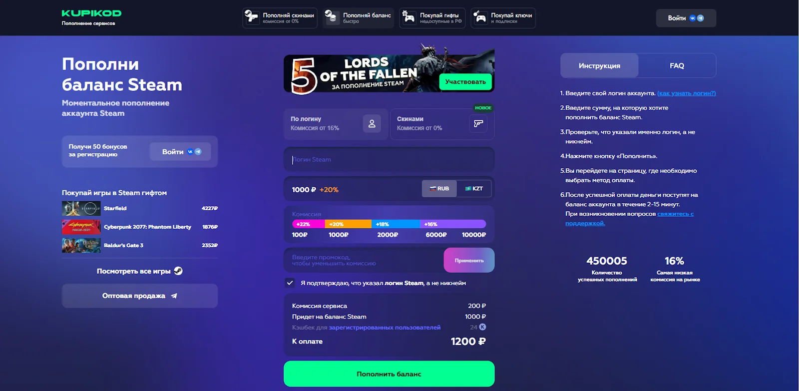 Пополнить Steam напрямую для жителей России практически невозможно, поэтому на помощь приходят специальные сервисы по типу steam.kupikod. Он предлагает своим клиентам моментальное пополнение и приемлемую комиссию на рынке, которая зависит от суммы пополнения — чем больше сумма, тем меньше комиссия.
