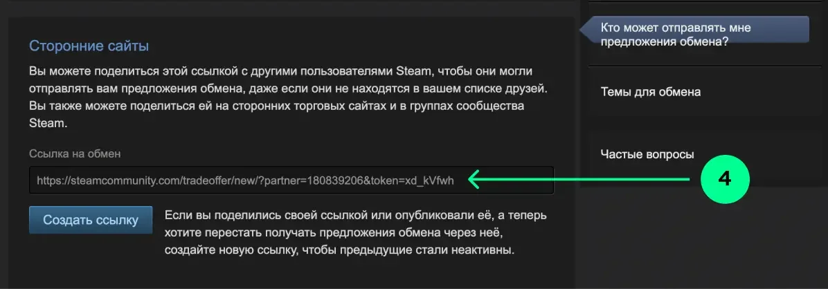 Пролистайте ниже и в разделе "Сторонние сайты" скопируйте трейд-ссылку.