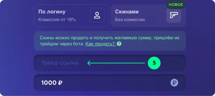 Вводим трейд ссылку. Трейд-ссылка – это ссылка на обмен в Steam, которая позволяет совершать обмен инвентарями в стим, на нее мы отправим тебе скины. Она нужна для того, чтобы проводить обмены с пользователями, которых нет в списке друзей. Вы можете найти ее в своем аккаунте Steam по инструкции, указанной в окне “Трейд-ссылка”.