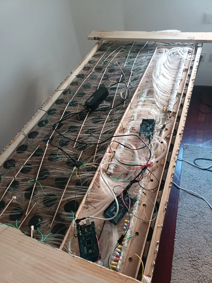 В итоге ардуино запрограммировал так, чтобы при подачи сигнала от определенного сенсора, соответствующий пучок оптоволокна плавно загорался и так же плавно тух при отсутствии сигнала. По мере изготовления столешницы я обзавелся диодным лазерным станком и решил вырезать крышку на короб им, но не учел что нужна вентиляция поэтому отверстия для нее делал шуруповёртом.