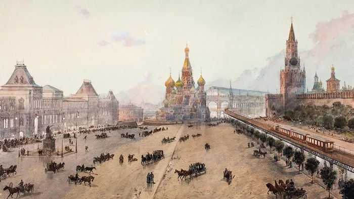 Открытая ветка метрополитена на Красной площади. Акварель по проекту инженеров Е.К. Кнорре и П.И. Балинского. Репродукция рисунка Н.Н. Каразина.