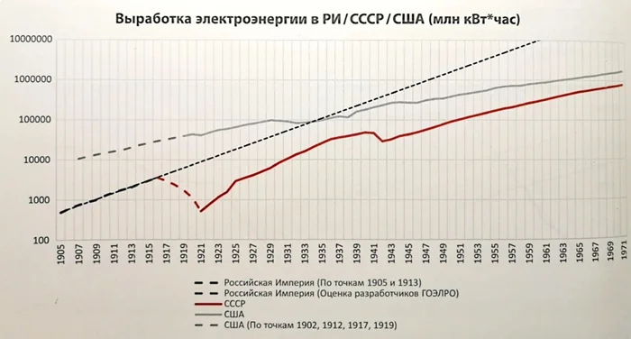 А вот пример совершенно некорректной экстраполяции. Берем две точки и строим по ним линию, уходяющую за горизонт. И ведь автора даже не смутило, что график для США и для СССР подчиняется одному правилу - чем дальше по шкале времени, тем менее крутым он становится (уменьшается прирост выработки электроэнергии). Что обусловлено вполне логичным насыщением промышленности и гражданского сектора электроэнергией.