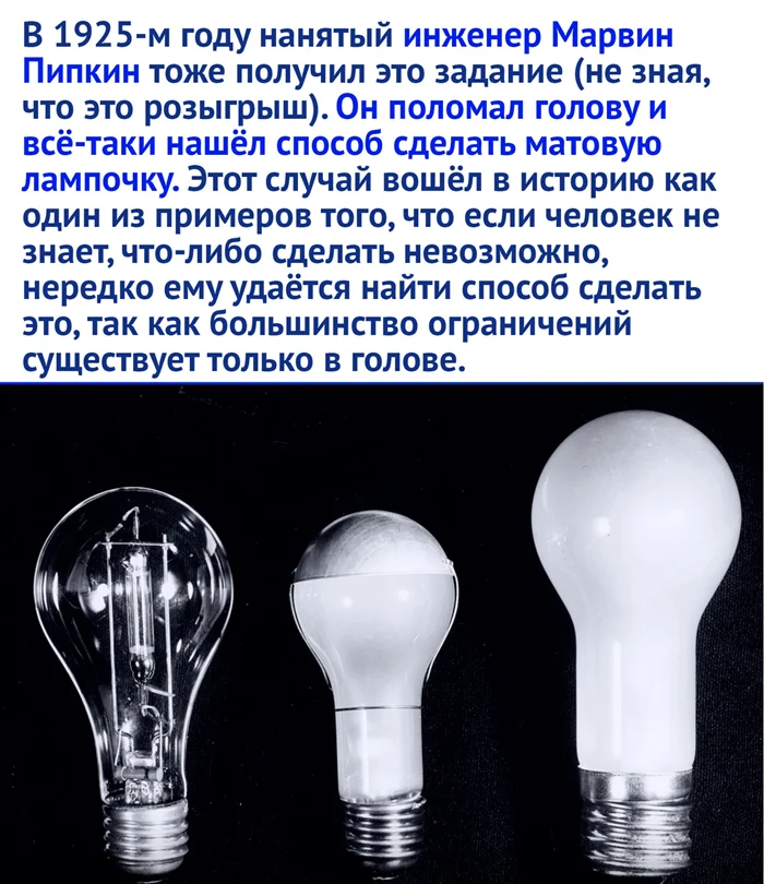 В профессиональных кругах есть легенда, что к своему инновационному подходу Пипкин пришёл в результате ошибки и форсмажорного случая. В своём первом тесте он по незнанию покрыл лампочку слишком слабым раствором. Чтобы не опозориться с неудачным опытом, химик решил счистить нанесённый слой и использовать ту же лампу снова. В процессе травления, он отлучился на телефонный звонок, а вернувшись, сслучайно сбил стеклянную колбу с верстака на пол. И ... она не разбилась! Так исследователь обратил внимание на более слабый раствор и решил вместо одного полного слоя, делать поочерёдно несколько менее плотных.