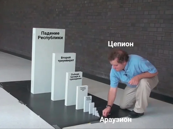 Самоуверенность, некомпетентность, глупость и жадность. Да. Из-за своих амбиций Цепион не увидел, что его действия ведут к катастрофе, причем не только на поле боя, но и в Риме. Варвары по отдельности сначала разбили войска Цепиона, а потом Маллия. В битве погибли больше 100 тысяч солдат и обозников - это в 2,5-3 раза больше потерь при Каннах, - битвы, которую римляне вспоминали как один из своих величайших позоров. Но там-то их переиграл сам Ганнибал, а тут - куча варваров. Не позор, а позорище. Араузионская катастрофа по потерям сумеет заткнуть за пояс все предыдущие и будущие поражения римлян и вызовет небывалые тектонические сдвиги в самой Республике. Именно на полях Араузиона стало неизбежным...
