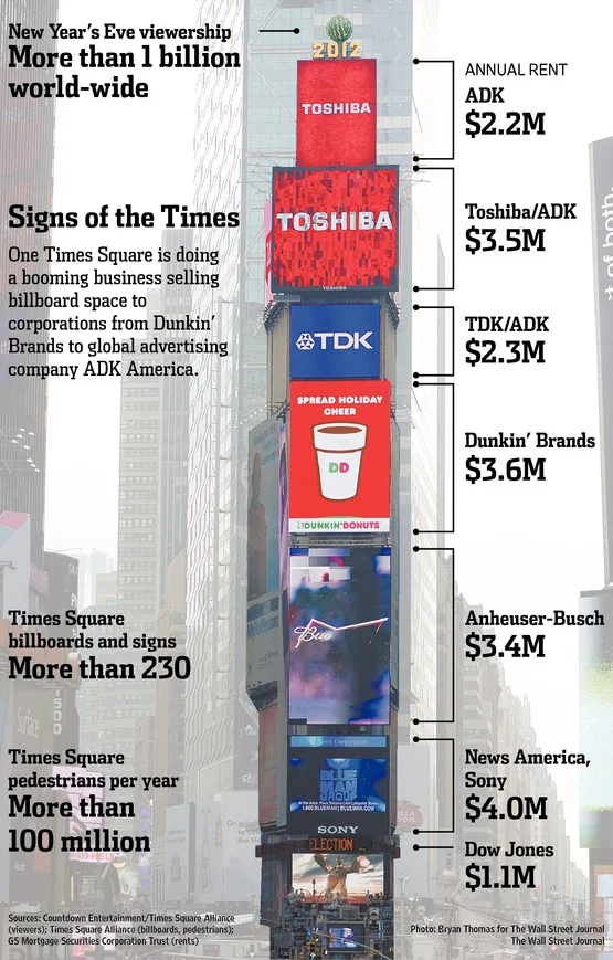 Когда в 1995 году Lehman Brothers приобрели One Times Square, они представили нового типа арендаторов: рекламодателей. Вместо того, чтобы сдавать офисы внутри 25-этажного здания, они начали переоборудовать фасад с помощью рекламных щитов.