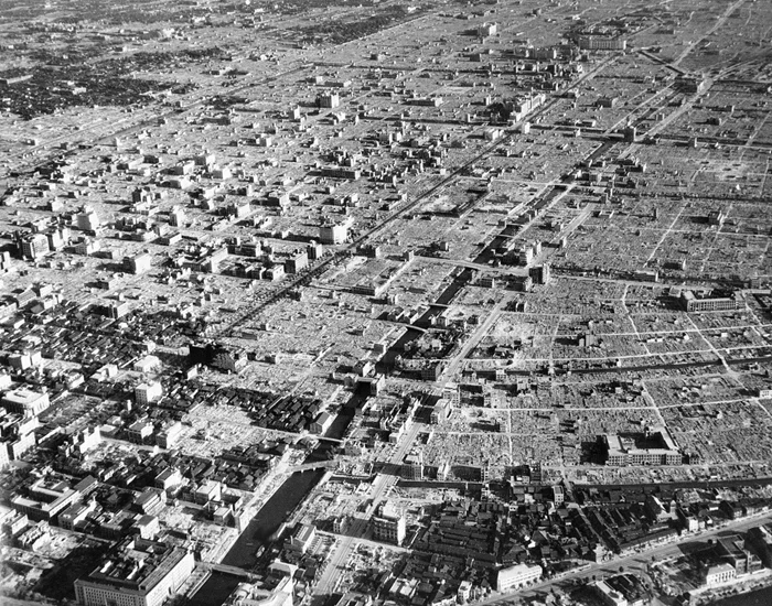 Огненный шторм характерен для крупных лесных пожаров, но в ту ночь он охватил город с 7 млн. жителей. Температура пламени достигала 1 тыс градусов Цельсия. На фото номер 1 можно наблюдать горящий город Дрезде – примерно такой же вид наблюдали пилоты “суперкрепостей” в ту ночь. В ходе этого смертоносного пожара погибло около 100 тысяч человек – больше, чем погибших от ядерных бомб в Хиросиме или Нагасаки. Еще 40 тысяч человек получили ранения. 250 тысяч зданий было уничтожено, более 1 млн человек стали бездомными. Завод Мусашино не пострадал, но на следующий день завод впервые остановился, все производственные цепочки были нарушены, а множество работников не вышли на работу, так как либо погибли, либо стали беженцами. Американцы же потеряли 14 “суперкрепостей” – самое большое количество потерь в одном вылете с 20 августа 1944г. Как и ожидалось, японские истребители не смогли навредить Б-29, а вот японская ствольная ПВО все же смогла удивить американцев. Дело в том, что японцы использовали новые радары управления огнем, которые позволяли вести огонь ночью и в плохую погоду. Также японцы усилили свою ствольную ПВО корабельными орудиями, снятыми с кораблей. Но несмотря на самые большие потери, это был самый успешный налет за всё время воздушной войны против Японии в тот момент. Именно этот налет стал предвестником конца. Именно после него стало ясно, что доктрина Дуэ сработает.