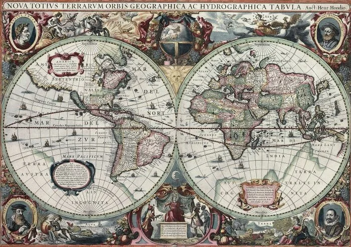 Хендрик Хондиус нарисовал карту мира Nova Totius Terrarum Orbis Geographica ac Hydrographica Tabula (Новая географическая и гидрографическая карта всего мира) в 1630 году, а в следующем году она была включена в приложение атласа Atlantis Maioris в Амстердаме. Картины символизируют четыре стихии: огонь, воздух, вода и земля. Также по углам атласа изображены Юлий Цезарь, Клавдий Птолемей и два первых издателя атласа, Герард Меркатор и Йодокус Хондиус, отец Хендрика.