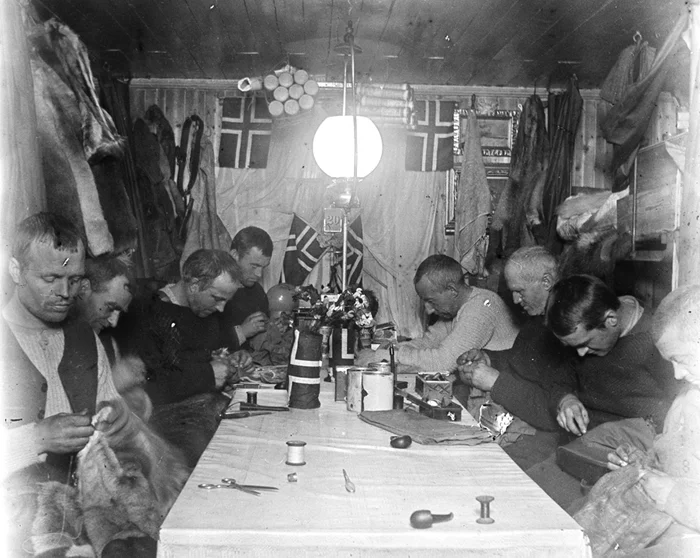 В кубрике «Йоа». Экипаж занят починкой одежды. На заднем плане справа Руал Амундсен