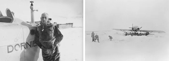 Слева: Амундсен готовится к полёту на гидросамолёте «Дорнье». Справа: расчистка полыньи для взлёта гидроплана «Дорнье»