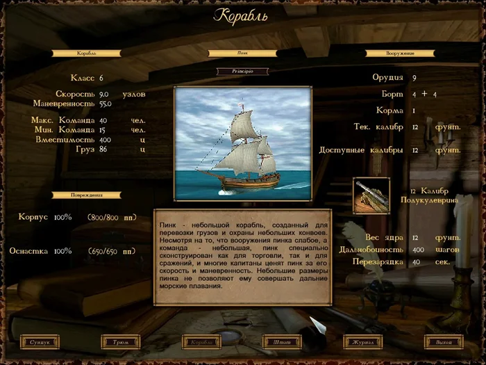 Не считая того, что с самого старта было доступно аж 4 квестовых линейки (хоть и не все они работали стабильно), лучшим украшением игры были, конечно, корабли. 6 рангов, более сорока штук, очень красивые и проработанные. До сих пор помню этот момент, когда смотришь в подзорную трубу с палубы (дрянную и треснувшую, чтобы найти получше, нужно было хорошенько попотеть), и вдали из тумана начинают проступать контуры вражеского корабля; ты понимаешь, что тебе никак его не одолеть, и начинаешь ставить все паруса и ловить ветер, чтобы удрать. Да, это всё было реализовано — и смена погоды (в шторм молния могла зажечь корабль и даже потопить), и смена дня и ночи, и ветер! План боя надо было строить, исходя от направления и силы ветра. 4 вида вооружения: книппели – сбивать мачты и рвать паруса, ядра – пробивать корпус, картечь – косить вражескую команду, ну и бомбы – делать это весело и с огоньком. Баланс завезли. Чем корабль «старше» и выше по рангам, тем больше на нём команды вмещается и пушек, но начинает страдать манёвренность. Так что вполне реально на низкоранговом корабле разобрать и даже взять на абордаж какой-либо фрегат. После потопления на месте крушения плавают разные бочки и доски, и можно подобрать разного товара и расходников.