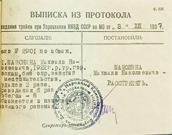 Так что приплыл как говорится Миша и ему были предъявлены обвинения по статьям: 142. Умышленное тяжкое телесное повреждение. 143. Умышленное легкое телесное повреждение. 74. Хулиганство. 82. Побег арестованного из-под стражи или места заключения. В связи с этими обстоятельствами, уголовное дело на Мишу было отправлено на рассмотрение тройки УНКВД, ну те и решили Шамонина расстрелять. Во так и не стало "несчастного" мальчика Миши, который будучи пьяным, начал резать людей как бешеный хорек. Что то после с ознакомления с материалами уголовного дела, ну никак не складывается образ "невинной жертвы репрессий", который нам навязывали несколько лет, лепя из уголовника обычного беспризорника расстрелянного за кражу двух буханок хлеба.