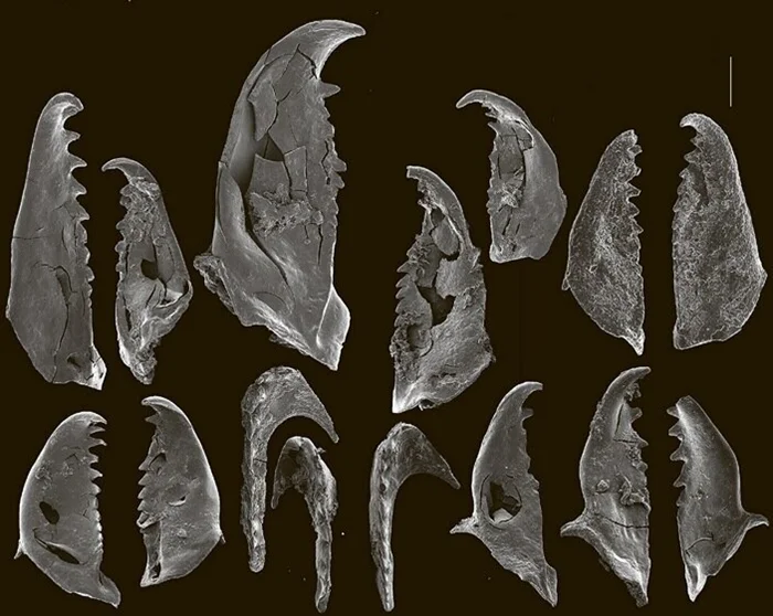 Окаменевшие остатки зубов древних многощетинковых червей – сколекодонты – известны учёным очень хорошо и находки их довольно многочисленны. Тело червя мягкое и крайне редко сохраняется в виде отпечатков, а вот прочные зубы из хитина превращаются в окаменелости и сохраняются просто отлично. Каких только «зубов» среди них нет! Тут и «когти», и «крюки», и «иглы», и «пилы», и «гарпуны».