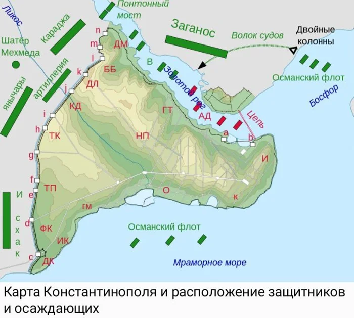 Константинополь тогда напоминал треугольник, две стороны которого образовывали Мраморное море и бухта Золотой Рог, а третья была сухопутной. С моря город считался недоступным; сухопутная западная сторона треугольника длиной приблизительно 10 км защищалась тысячелетними двойными крепостными каменными стенами и рвом глубиной более 30 метров. Свою атаку турки-османы, не очень хорошие моряки, решили начать с суши. Турки пытались делать подкопы, засыпали ров бочками, деревьями, камнями, землей, а также своими телами, методично обстреливали крепостные стены. Сравнительно новое тогда пороховое оружие здесь причудливо смешалось со старинным — огонь, дым, выстрелы пороховых пушек, тучи стрел и метательных копий. Кроме пушек использовались также катапульты. А вскоре задействовали еще гигантскую передвижную осадную деревянную башню, вооруженную мортирами и обшитую тройным слоем бычьей кожи; ее использовали также для наведения перекидных мостов и подвоза амуниции, камней, солдат и обслуги.