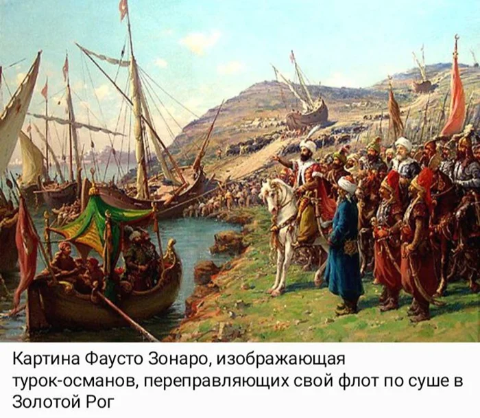 Султан придумал почти сказочный план — переместить по суше легкие корабли и амуницию с Босфора на левый берег Золотого Рога выше устья, в то место, где бухта не защищалась. Берег бухты был здесь крутой, неровный, заросший кустами. Ночью турки расчистили дорогу вдоль бухты, покрыли ее крепкими деревянными платформами, смазанными маслом и овечьим жиром, и — потянули по ним 70 легких галер и бригантин.