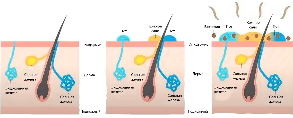 Нормальная кожа головы имеет сальные и потовые железы благодаря которым и образуется это самое кожное сало