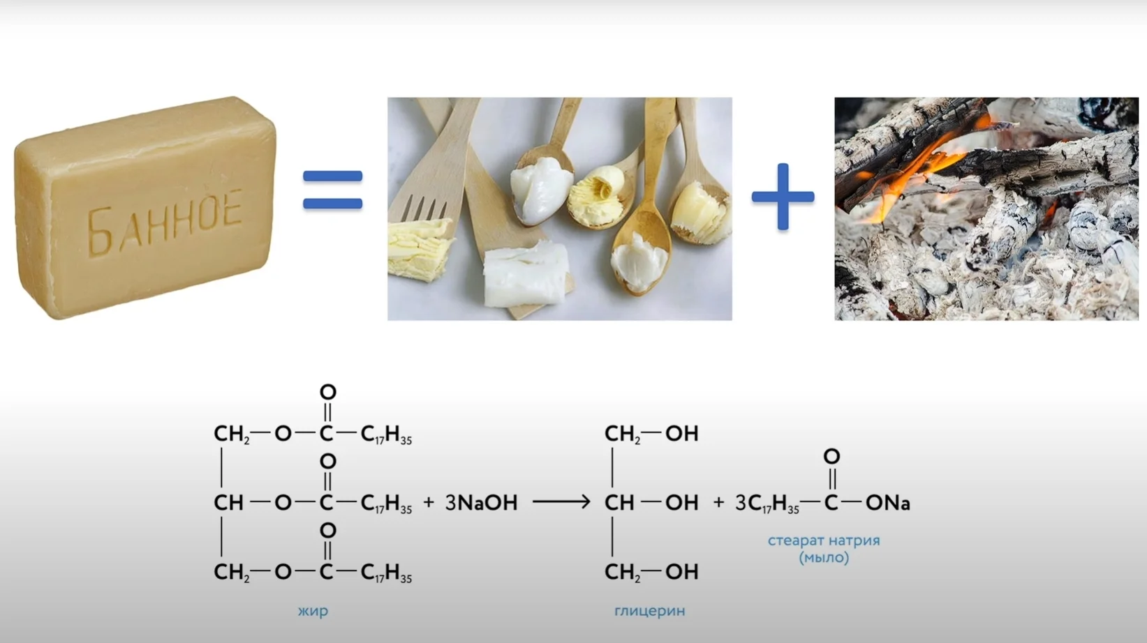 Самое известное такое вещество это конечно мыло, мы берем жир, чтобы убрать жир и модифицируем его с помощью щелочи