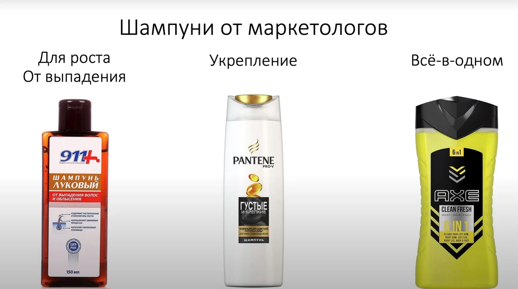 Есть еще разного рода шампуни от маркетологов, я их называю сказочные шампуни. Естественно не бывает никаких шампуней от выпадения волос или для укрепления, чтобы ваши волосы стали густые и крепкие. Нужно запомнить только одну вещь - у шампуня цель смыть лишний жир с кожи вашей головы и волос, все остальное это маркетинговые уловки.