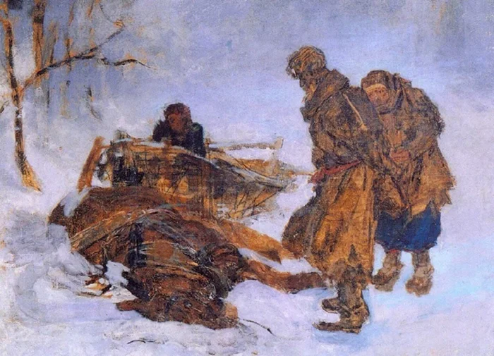 Или вот этюд «Павшая лошадь». Что такое лошадь для крестьянской семьи, объяснять не надо, мы сейчас не в детском журнале. Не на чем пахать или заниматься извозом – пойдёшь в батраки. Купить другую? А продать что для этого? Горе. Никто не заламывает рук и не падает на колени, мужчина стоит, заложив руки за спину и молчит. И женщины не ждут от него слов. Что тут скажешь.