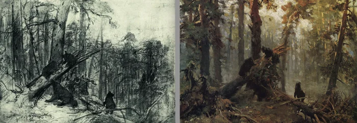 А изображал-то их Шишкин сам. Взгляните на эскизы, карандашный и в краске.