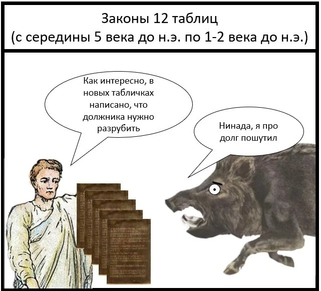 Эти законы регулировали все сферы жизни общества и основные проблемы. Законы 12 таблиц отменяли действие всех существовавших до этого норм, противоречивших им, и стали базой римского права. Правда, от некоторых норм у современного юриста волосы дыбом бы встали (разрубание должников, да), но в целом, это уже была твёрдая основа для юридической системы. Однако после этого бешеный принтер не остановился, и к 1 веку до н.э. римская правовая система имела сотни законов, которые дополняли или вообще отменяли положения законов 12 таблиц.