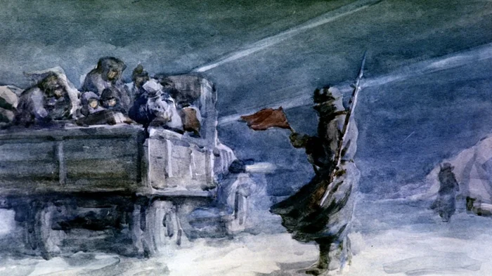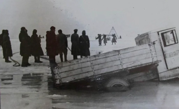 Однако еще более выматывающей и опасной чем у шоферов была работа регулировщиков. На трассе дежурило 350 человек поодиночке. Регулировщики должны были выставлять фонари и вешки, и следить за дистанцией, а также за льдом. Как только машины выбивали колею, регулировщик тут же должен был бежать переставлять вехи и фонари и переводить следующий караван на новый маршрут. Этим людям приходилось часами стоять на диком ветру, который сдвигал даже скользящие по льду полуторки, без всякой возможности обогреться. По соседству дежурили аварийные команды на эвакуационных летучках. Если машина проваливалась, к месту аварии тут же неслись люди, чьей задачей было вытянуть машину прежде, чем она уйдет под лед окончательно. Транспорт тащили к стационарному пункту техпомощи – тоже на льду. Кроме регулировщиков и аварийщиков, на льду стояли станции из 3-4 человек во главе с офицером, следившие целенаправленно за ледовой обстановкой. Трещины, полыньи, изменение толщины льда – обо всем тут же сообщалось командованию. Наконец, вдоль дороги курсировали пешие патрули – следили за порядком и подбирали потерянное на трассе имущество.