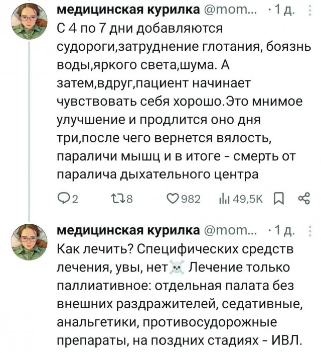 както коротко написали про лечение, и к слову какой смысл идти к врачу если летальность 100% ? а какже те самые 40 уколов в живот которые помогают избавиться от бешенства если с момента заражения прошло совсем немного времени ?