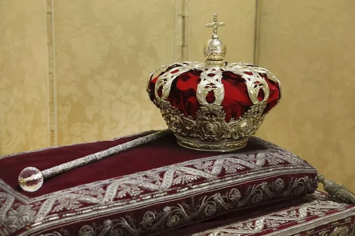 На картине изображён император Александр III - в его руках символы самодержавия: скипетр в правой руке и держава в левой.