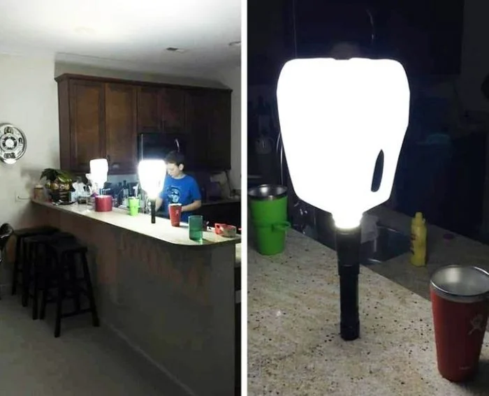 13. «При отключении света используйте прозрачные канистры для увеличения светоотдачи от фонарика. Работает отлично!».