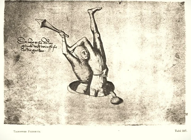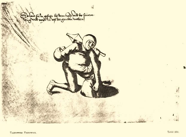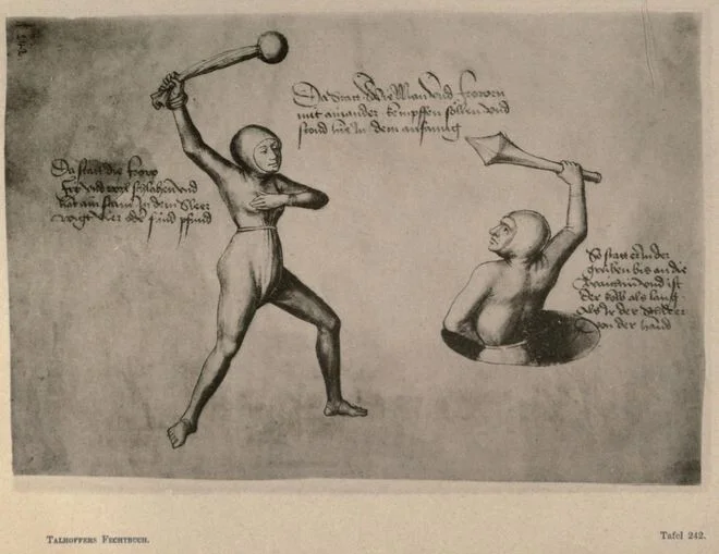 Её противник – мужчина с дубиной, стоит по пояс в яме (чтобы «сровнять» шансы на победу). Мужчина ограничен в движении, а у женщины есть преимущество в дальности атаки. Но это не значит, что победа ей обеспечена. Тальхоффер, как мы увидим дальше, делает ставку на оборону и использование слабых сторон и ошибок противника.
