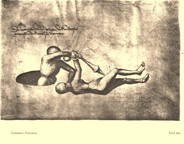 И наконец – финальный рисунок. Женщина хватает мужчину за шею и... за пах (ну да, на войне все средства были хороши) и пытается провести одновременно болевой и удушающий приемы :)) Победа женщины? Возможно. Тальхоффер не даёт однозначного ответа. Но сам факт того, что он описывает такую возможность, говорит о многом.